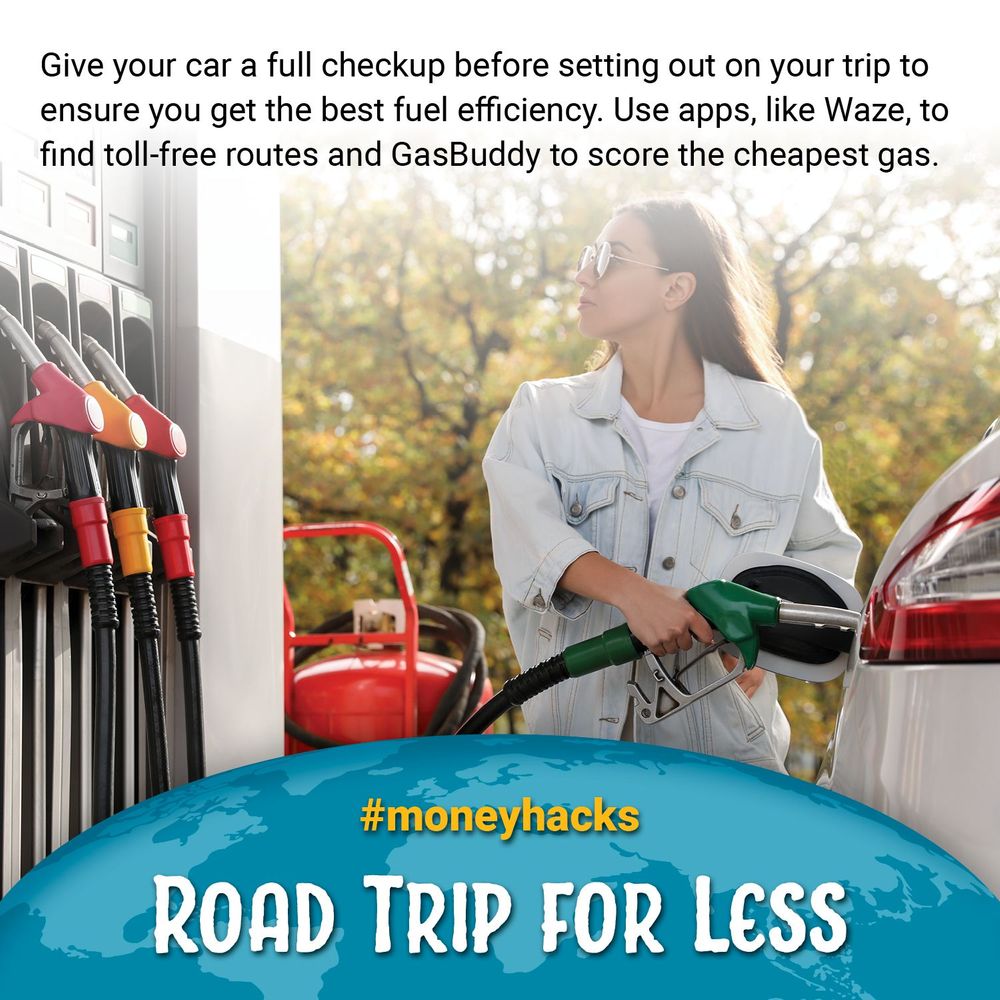 Give your car a full checkup before setting out on your trip to ensure you get the best fuel efficiency. Use apps, like Waze, to find toll-free routes and GasBuddy to score the cheapest gas.